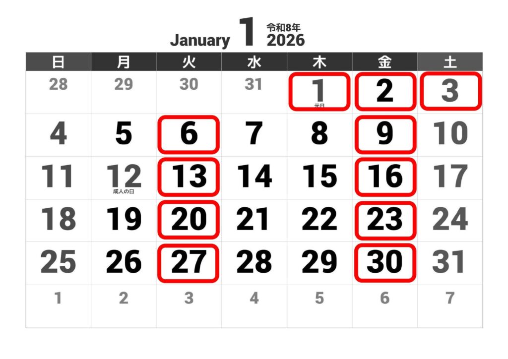 年始は、3日までが休診、4日からの通常診療開始です。 それ以降は通常通り、火・金曜日が休診となります。